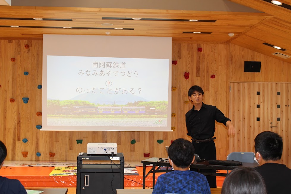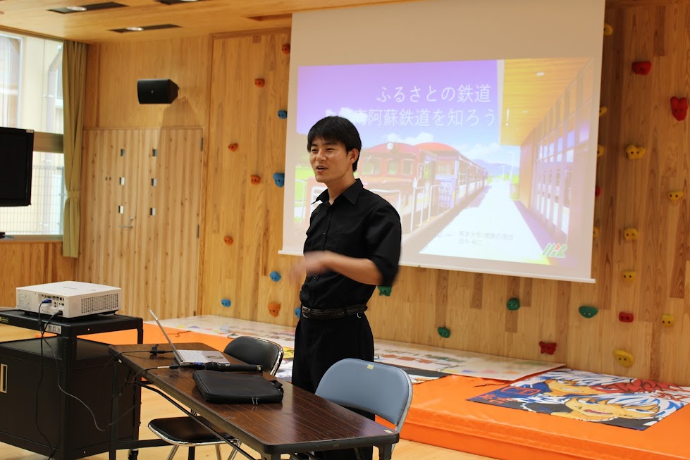 南阿蘇鉄道by 白水小学校 6年生in 未分類on 投稿日: 2023年12月18日2024年3月10日 南阿蘇鉄道 南鉄の線路について もともと南阿蘇鉄道は宮崎と熊本を繋ごうとしていました。しかし、トンネルをほっている途中で水が出てきてしまい、宮崎と繋げなくなってしまいました。そこで、線路を曲げて高森駅を終点にして線路を作ったのだそうです。※グーグルマップを見ると高森などの線路が曲がっているのがわかります。 復興したことでよくなったこと 熊本から南阿蘇まで車に乗らず安く列車に乗ることができるようになりました。また、車がない人でも阿蘇に足を運びやすくなり、みんなが南阿蘇に来やすくなりました。 ↑南鉄応援団の田中裕二さんです。白水小学校に来校され、南阿蘇鉄道について教えていただきました。また、インタビューにも応えてくださいました。 観光列車『ゆうすげ号』について なぜゆうすげ号を作ったのか 元々、南阿蘇鉄道は国鉄が管理していました。そこで、南阿蘇鉄道に乗る通勤者、通学者だけでなく幅広い年代の方々に使ってほしいという思いから観光用の列車を作ったそうです。 ゆうすげ号の名前の由来 ゆうすげとは花の名前で、7月には南阿蘇村でそのゆうすげの花がたくさん咲きます。そこから、ゆうすげ号という名前になったそうです。 ゆうすげ号を作るうえでの工夫 普通列車は窓がついていますが、ゆうすげ号は窓がなく外の風景を楽しめるようにしてあります。また、風が列車内を吹き抜け、空気も体で感じることができます。自然豊かな南阿蘇の良さをより感じる事ができます。 ゆうすげ号のいいところ 窓がないため、自然と近く触れ合えるところや線路でしか見えない景色があります。また、いろいろな人と触れ合うこともできます。各名所では、電車を停めて車掌さんがくわしく説明してくださいます。